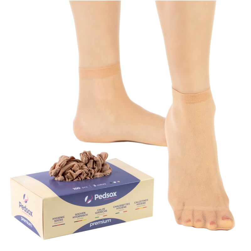 Unisex-Socken für die Schuh-Anprobe, erhältlich in den Farben: hautfarben, schwarz und weiß. Schachteln mit 100 Stück.